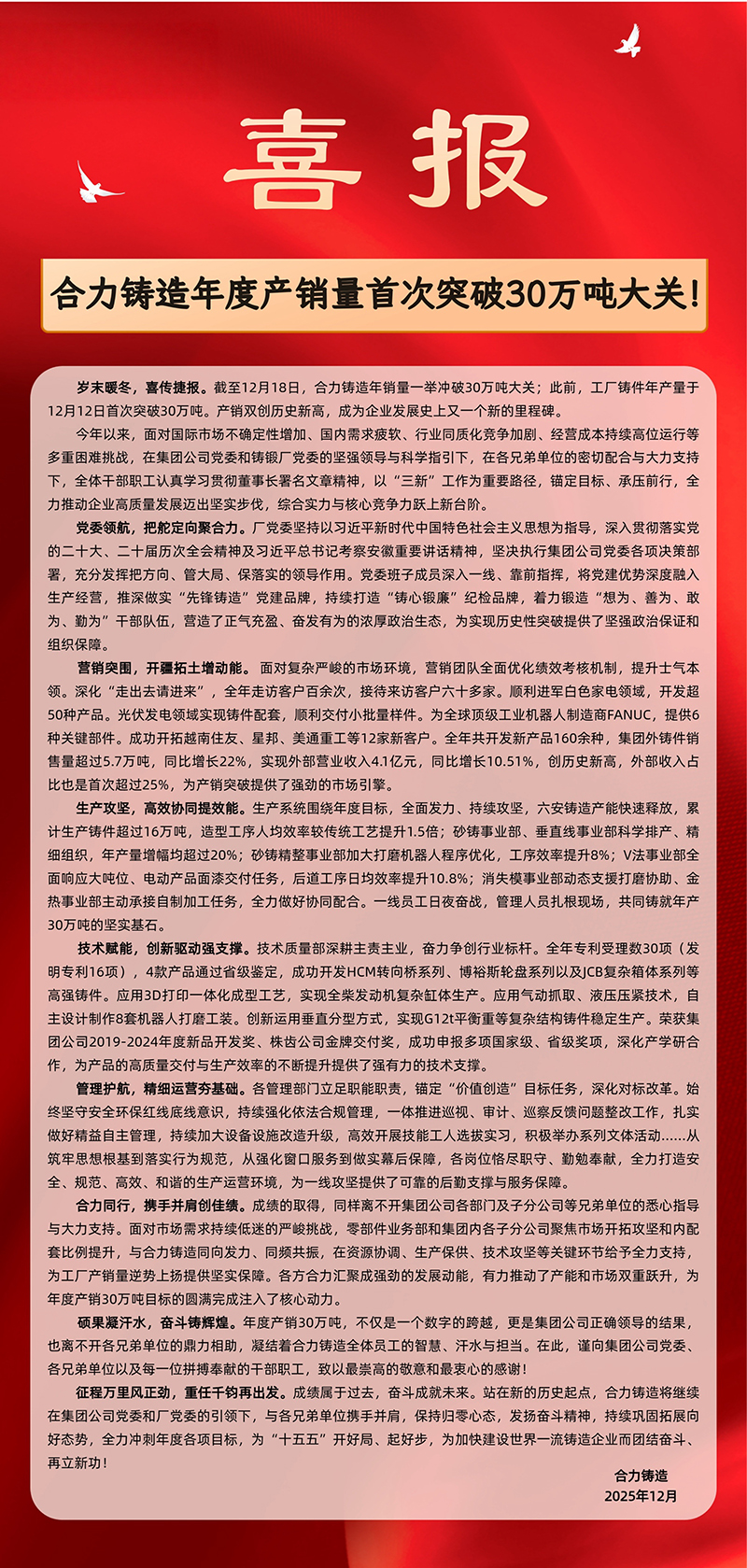 安徽合力股份有限公司合肥鑄鍛廠是安徽合力股份有限公司的核心企業(yè)之一,是中國(guó)鑄協(xié)副會(huì)長(zhǎng)單位、安徽省鑄協(xié)會(huì)長(zhǎng)單位、全國(guó)消失模與V法協(xié)會(huì)及學(xué)會(huì)副理事長(zhǎng)單位、華東鑄協(xié)常務(wù)理事單位,系中國(guó)綠色鑄造示范企業(yè)、中國(guó)鑄造行業(yè)綜合百?gòu)?qiáng)企業(yè)、全國(guó)鑄鐵行業(yè)及安徽省鑄造行業(yè)排頭兵、中國(guó)鑄造行業(yè)教育培訓(xùn)基地。2015年企業(yè)成立了“國(guó)家開放大學(xué)鑄造學(xué)院學(xué)習(xí)中心”。