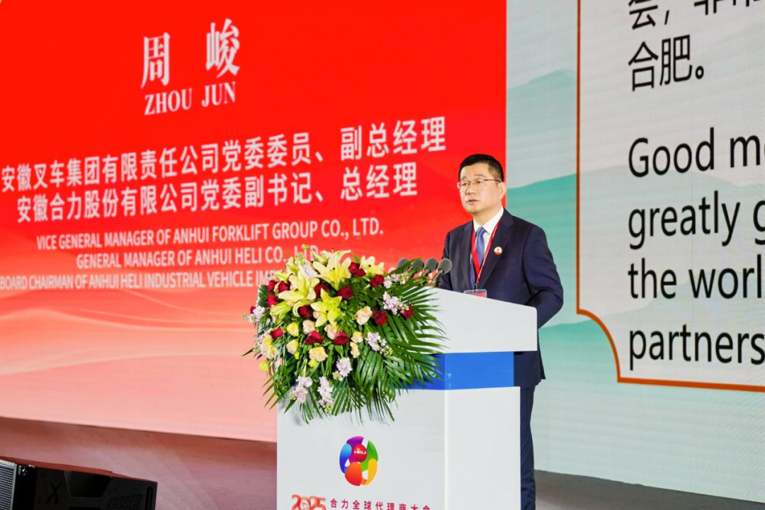 楊安國(guó)致歡迎辭,代表公司對(duì)各位新老朋友的到來(lái)表示誠(chéng)摯的歡迎和感謝。他表示,合力的發(fā)展深深植根于江淮沃土,在合作伙伴的共同努力下,連續(xù)34年蟬聯(lián)中國(guó)工業(yè)車輛行業(yè)榜首,預(yù)計(jì)今年?duì)I業(yè)收入將突破200億元,較首屆代理商大會(huì)時(shí)實(shí)現(xiàn)翻番;海外業(yè)務(wù)營(yíng)收預(yù)計(jì)超80億元,增長(zhǎng)近5倍。目前,合力全球代理商網(wǎng)絡(luò)已擴(kuò)展至400余家,業(yè)務(wù)遍及180多個(gè)國(guó)家和地區(qū),在34個(gè)海外市場(chǎng)中占有率位列第一。當(dāng)前合力已建成覆蓋歐洲、北美、東南亞等地的八大海外中心,設(shè)立首個(gè)海外研發(fā)中心與海外制造基地,構(gòu)建了“全球研發(fā)+本地制造+區(qū)域服務(wù)”的一體化運(yùn)營(yíng)模式。面向未來(lái),合力將堅(jiān)持創(chuàng)新驅(qū)動(dòng),推進(jìn)“電動(dòng)化+智能化”雙輪驅(qū)動(dòng)戰(zhàn)略,加快綠色轉(zhuǎn)型,構(gòu)建ESG戰(zhàn)略體系,深化開(kāi)放合作,與全球伙伴共建發(fā)展共同體,開(kāi)創(chuàng)合作共贏新局面。